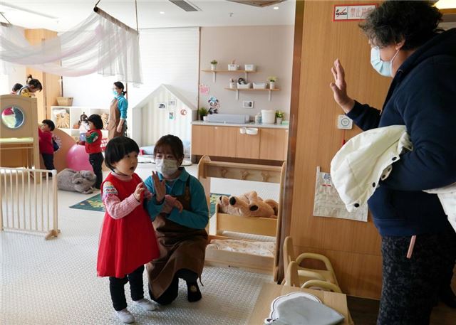 在上海市江宁路街道社区综合为老服务中心的“宝宝屋”,小朋友与外婆挥手说再见。新华社记者刘颖 摄