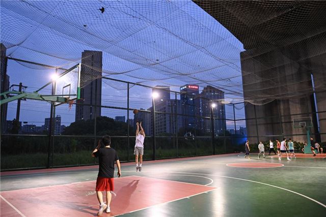 浙江杭州,市民在位于高铁桥下的钱江世纪城体育公园打篮球。新华社记者黄宗治 摄