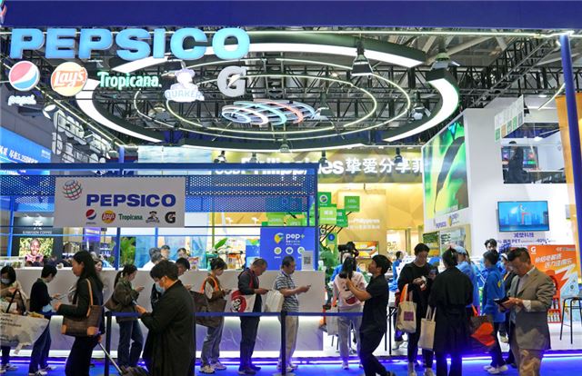 2023年11月8日在第六届进博会食品及农产品展区拍摄的百事公司展台。新华社记者 刘颖 摄
