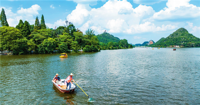 志愿者在贵州省安顺市西秀区虹山湖打捞湖面漂浮物(2024年8月15日摄) 陈熙摄/本刊