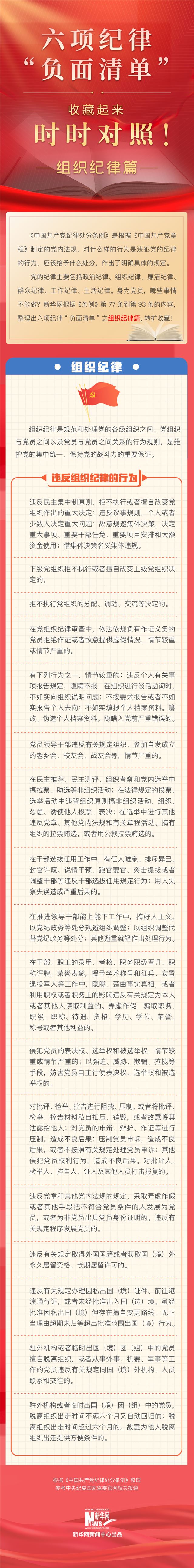 当前,全党正在开展党纪学习教育。这次党纪学习教育明确要聚焦解决一些党员、干部对党规党纪不上心、不了解、不掌握等问题,组织党员特别是党员领导干部认真学习《中国共产党纪律处分条例》,做到学纪、知纪、明纪、守纪,搞清楚党的纪律规矩是什么,弄明白能干什么、不能干什么,把遵规守纪刻印在心,内化为言行准则,进一步强化纪律意识、加强自我约束、提高免疫能力,增强政治定力、纪律定力、道德定力、抵腐定力,始终做到忠诚干净担当。新华网根据《条例》内容,整理出六项纪律“负面清单”。今天推出“负面清单”之组织纪律篇,一起收藏学习。