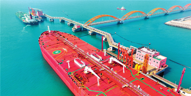 在山东港口日照港岚山港区30 万吨级油品码头,船舶停靠进行卸油作业(2024年3月29日摄)郭绪雷摄 / 本刊