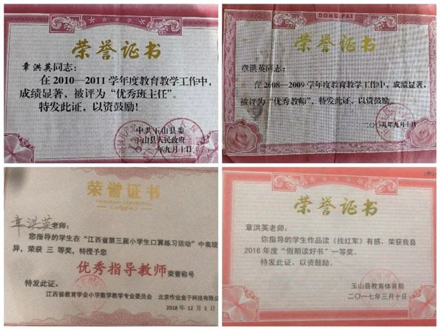 章洪英,女,中小学一级教师,1995年毕业于上饶师范,后通过自学考试取得了本科学历。29年教学生涯中,有16年的乡村教学经历(后通过考试进入冰溪小学)和23年的班主任工作经验,对教育管理学生,她有着自己独特的理解和深刻的体会,并始终默默践行,甘为人梯,成就了一批又一批孩子的成长成才,先后荣获玉山县优秀班主任、玉山县优秀教师等称号。