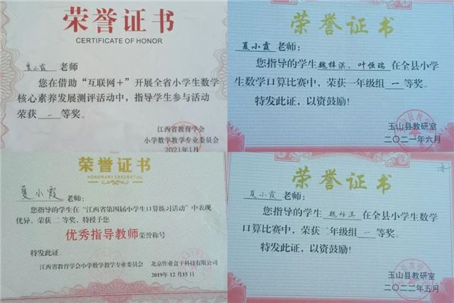 在她的眼里,每一个孩子都是栋梁之材,每一块“顽石 ”都能雕琢成一块玲珑剔透的美玉。她特别注重培优扶差工作,对于学习有困难的学生,她总是给予更多的关注和帮助,在课堂上多提问、多鼓励、多辅导,让他们感受到老师的温暖和关怀;对于学习优秀的学生,她则鼓励他们继续努力,不断挑战自我,实现更高的目标。在她的指导下,学生们在线上口算比赛中荣获省级奖4次,现场口算比赛中连续三年荣获县级一等奖,指导学生数学手抄报获县级一等奖,她也被评为省级优秀指导教师。