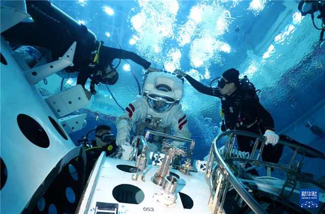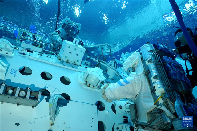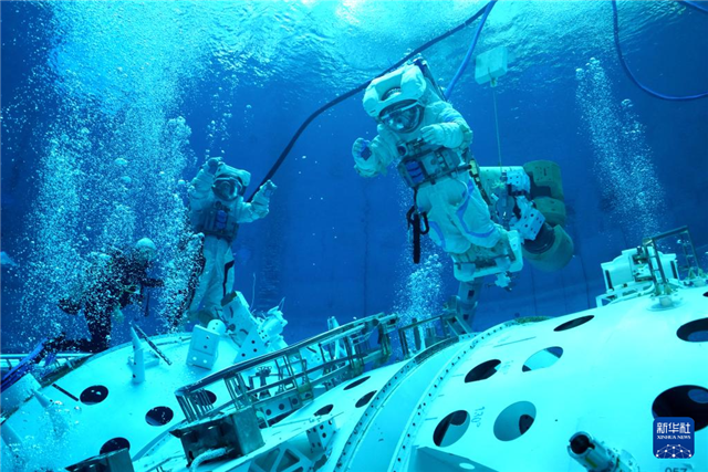 神舟十九号航天员乘组进行舱外航天服操作训练(2024年6月21日摄)。新华社发(徐部摄)