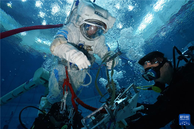 出舱程序训练中,航天员需要穿上100多公斤重的舱外航天服,模拟出舱过闸段动作。由于服装内加了0.4个大气压,王浩泽举手投足比较费力,加上在头盔内头部活动受限,视野也变得狭窄,只能借助腕部反光镜来扩大视野。