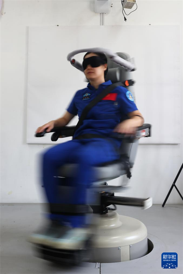 神舟十九号航天员王浩泽进行转椅训练(2024年6月17日摄)。新华社发(徐部摄)
