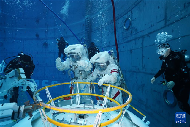 神舟十九号航天员蔡旭哲(上)和宋令东(下)进行水下训练(2024年9月2日摄)。新华社发(孔方舟摄)