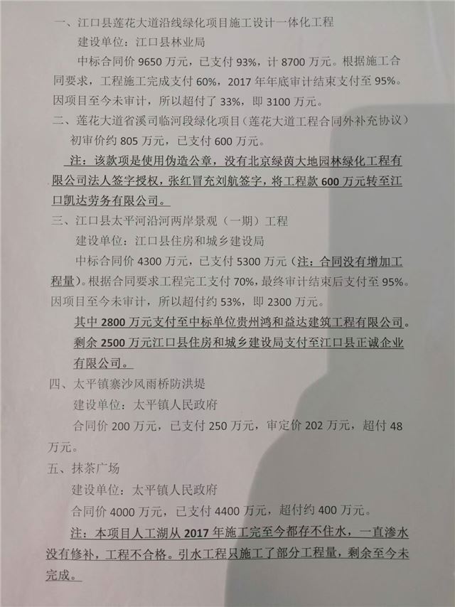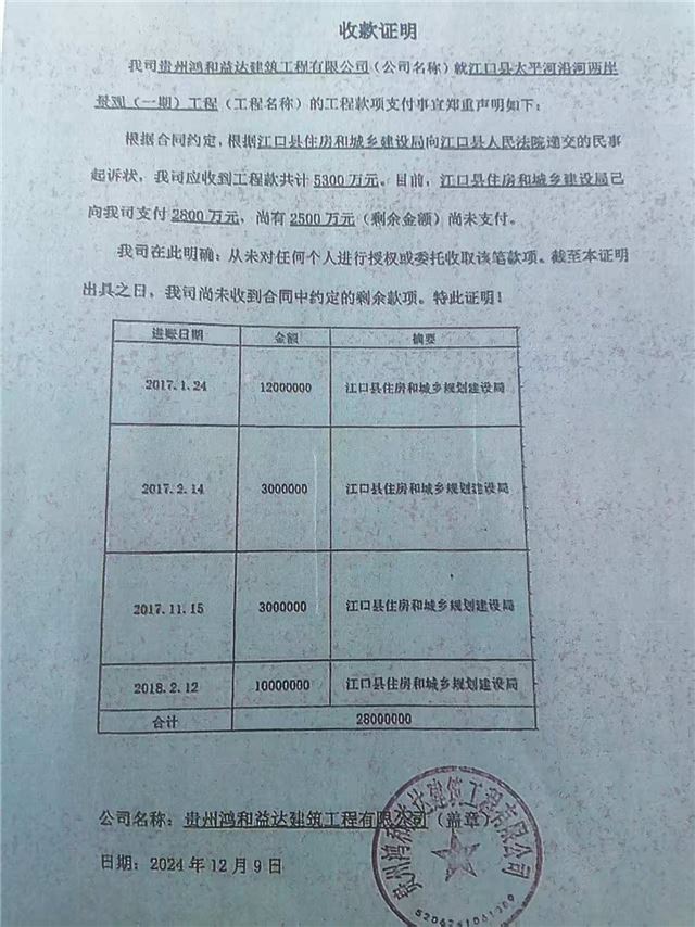 2021年3月,实际施工人薛建兴发现,太平河沿岸景观工程款被江口县住建局付给与中标单位贵州鸿和益达公司毫无关联的江口正诚企业2500万元。