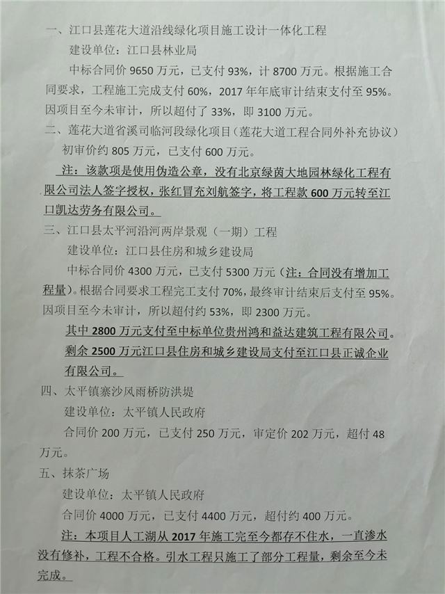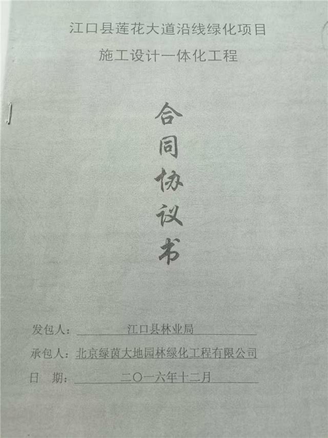 此外,北京绿茵大地园林绿化工程有限公司于2016年12月份中标江口县莲花大道沿线景观工程项目。中标价9650万元,合同约定工程完工支付60%的款。该工程于2017年元月施工,2017年8月完工。2018年江口县林业局协同监理单位、施工单位进行了竣工验收和工程量的核实清点,工程量无异议。