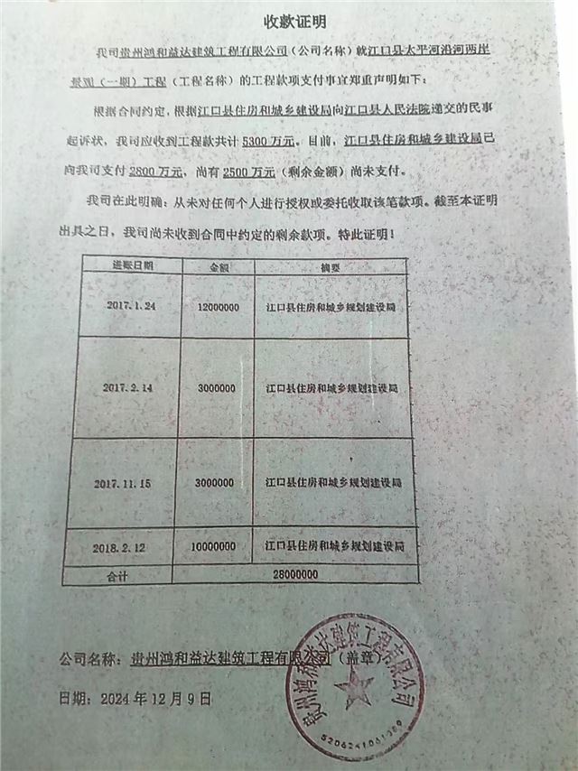 其中,2800万元支付至中标单位贵州鸿和益达建筑工程有限公司。剩余2500万元江口县住房和城乡建设局支付至江口县正诚企业有限公司。