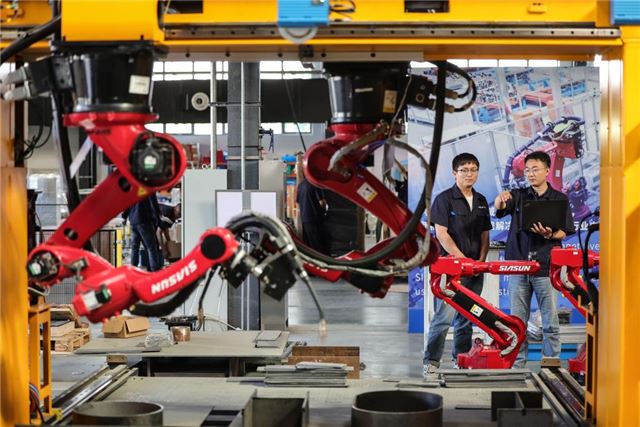 6月3日,在辽宁沈阳,沈阳新松机器人自动化股份有限公司的机器人研发工程师在讨论智能焊接机器人平台焊接方案。新华社记者潘昱龙摄