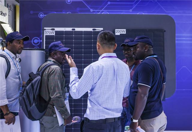4月15日,参展商在第135届广交会上向采购商介绍太阳能电池组件展品。新华社记者刘大伟摄