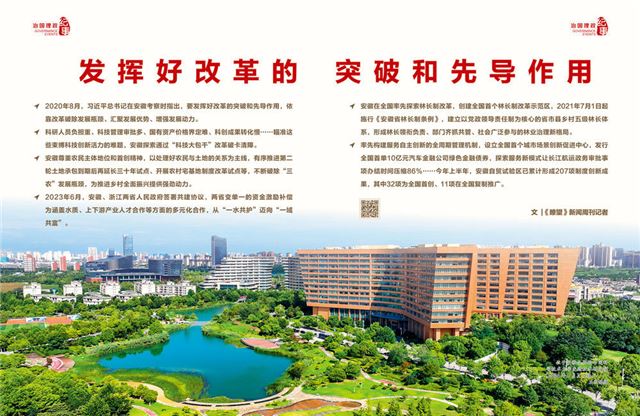 守护绿水青山,收获金山银山。安徽在全国率先探索林长制改革,创建全国首个林长制改革示范区,2021年7月1日起施行《安徽省林长制条例》,建立以党政领导责任制为核心的省市县乡村五级林长体系,形成林长领衔负责、部门齐抓共管、社会广泛参与的林业治理新格局。