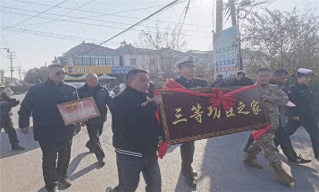 近日,中国人民解放军海军92145部队来到兴东镇,与兴化市退役军人事务局、兴东镇一道为现役军人顾国鹏家庭送上“三等功臣之家”牌匾、立功喜报和奖励金。