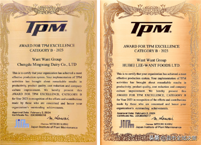 近日,由JIPM协会主办的2023年度TPM颁奖礼在京都隆重举行,旺旺集团旗下成都明旺、湖北立旺两家工厂凭借全员生产维护(TPM)方面的卓越表现,双双荣获TPM优秀奖。这是旺旺集团继旗下乳饮、包材工厂获得TPM优秀奖、TPM持续优秀奖后,米果、糖果工厂再获TPM大奖,也是国内米果与糖果行业在TPM领域的领先突破。