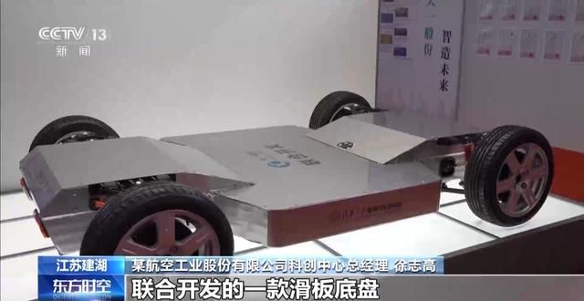 江苏某航空工业股份有限公司科创中心总经理 徐志高:这款是和高校联合开发的一款滑板底盘,这款产品最大的特性就是我们现在用于航空物流低空领域的物流底盘,就是在这个地方进行承载,它是一个超级底盘,上面可以上装可以延展,实现方向、油门、灯光、转向,所有的控制在这里面。