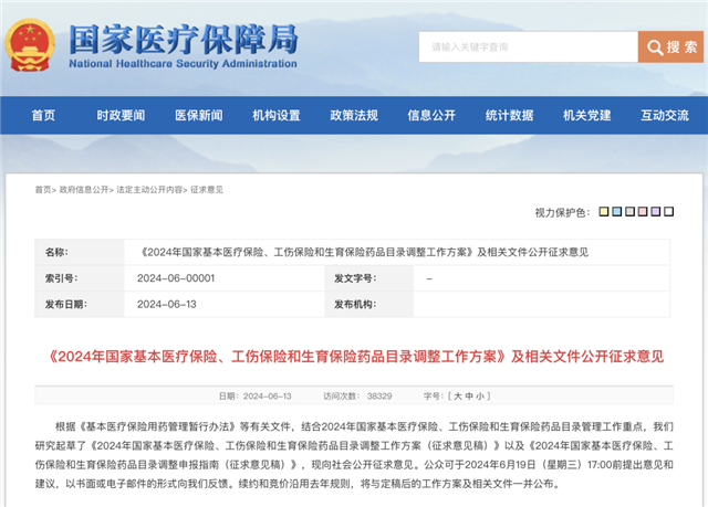新华社北京6月13日电(记者彭韵佳)国家医保局13日发布《2024年国家基本医疗保险、工伤保险和生育保险药品目录调整工作方案(征求意见稿)》及相关文件,向社会公开征求意见。