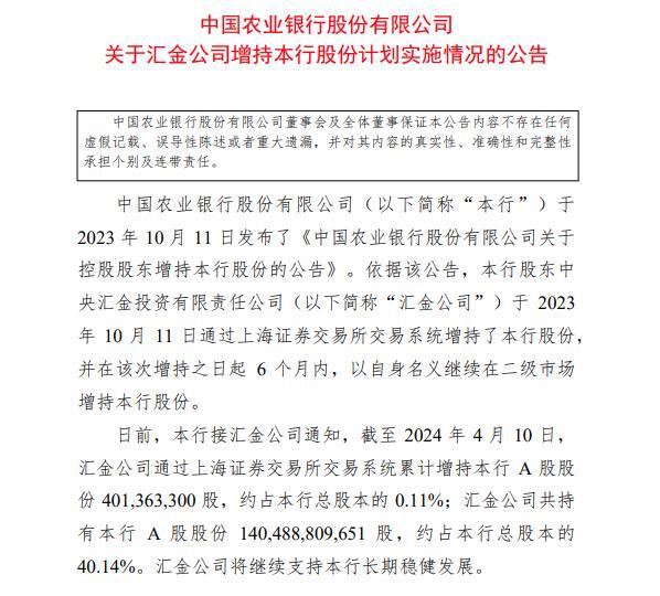 农业银行公告称,截至2024年4月10日,汇金公司通过上海证券交易所交易系统累计增持本行A股股份401,363,300股,约占本行总股本的0.11%;汇金公司共持有本行A股股份140,488,809,651股,约占本行总股本的40.14%。