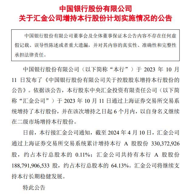 中国银行公告称,截至2024年4月10日,汇金公司通过上海证券交易所交易系统累计增持本行A股股份330,372,926股,约占本行总股本的0.11%;汇金公司共持有本行A股股份188,791,906,533股,约占本行总股本的64.13%。
