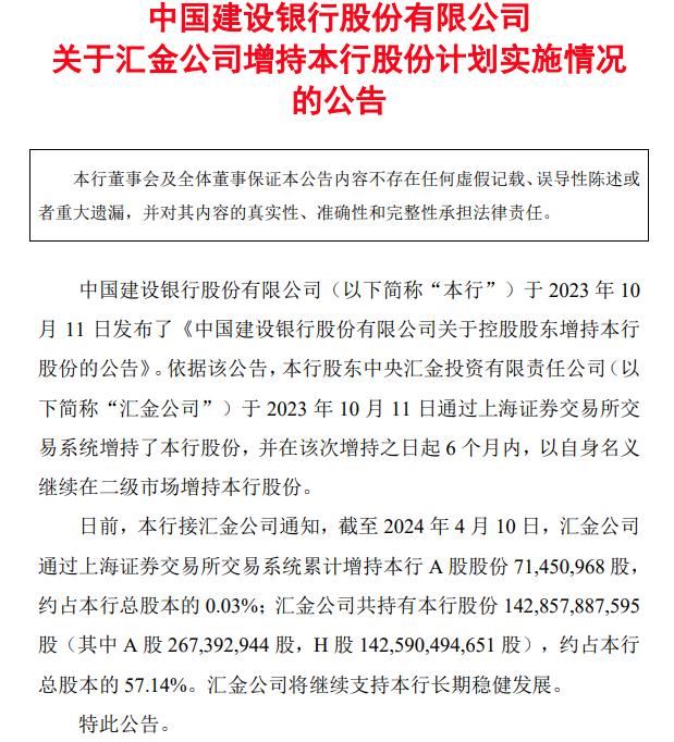 建设银行公告称,截至2024年4月10日,汇金公司通过上海证券交易所交易系统累计增持建设银行A股股份71,450,968股,约占建设银行总股本的0.03%;汇金公司共持有建设银行股份142,857,887,595股(其中A股267,392,944股,H 股142,590,494,651股),约占建设银行总股本的57.14%。