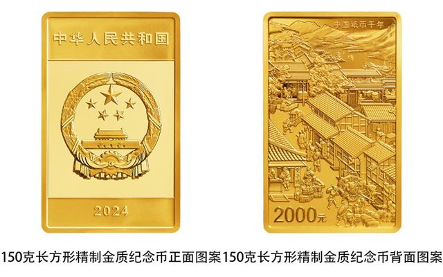 该套纪念币正面图案均为中华人民共和国国徽,并刊国名、年号。其中,150克长方形金质纪念币背面图案为北宋成都典型市井街巷、商贸活动场景及地域特色景观等组合设计,并刊“中国纸币千年”字样及面额。150克长方形金质纪念币最大发行量500枚。