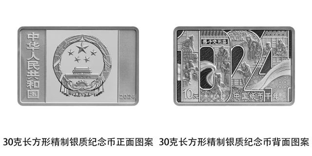 30克长方形银质纪念币背面图案为数字“1024”、益州交子务、纸币兑换场景及飘带等组合设计,并刊“中国纸币千年”字样及面额。30克长方形银质纪念币最大发行量20000枚。