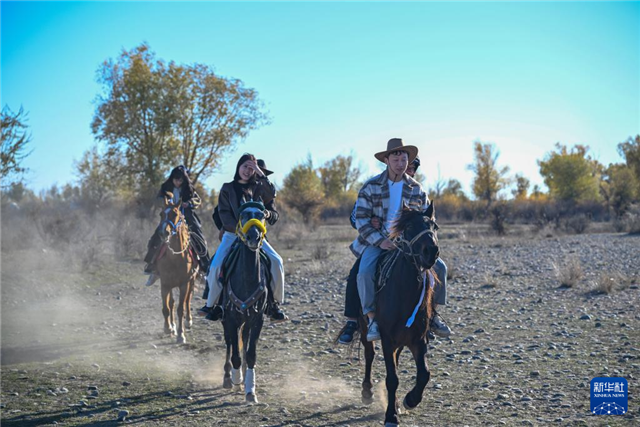 10月4日,在新疆阿勒泰地区哈巴河县,游客在网络剧《我的阿勒泰》取景地“彩虹布拉克”体验骑马。新华社记者 陈朔 摄