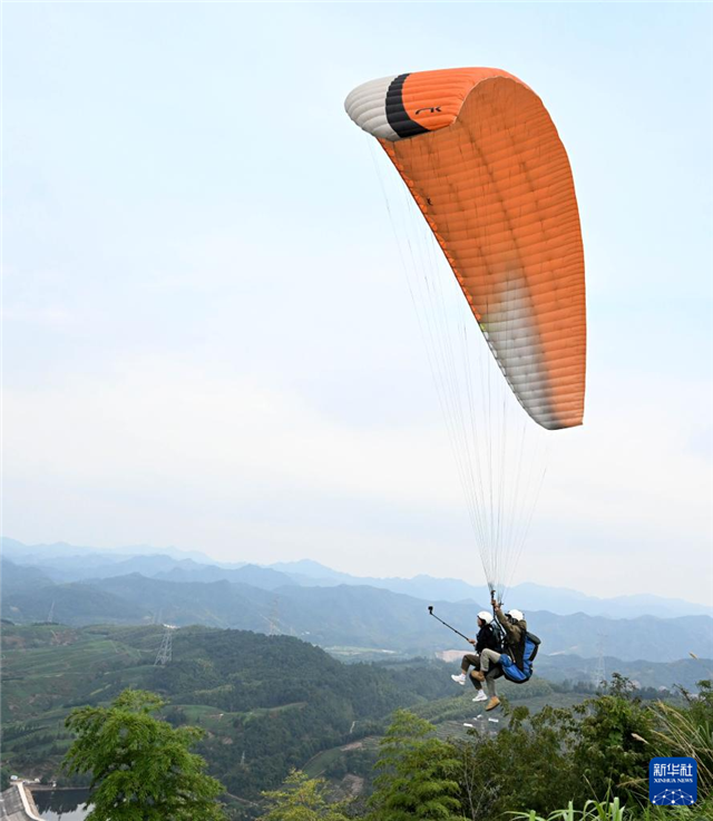 10月4日,游客在位于浙江省武义县的大斗山飞行营地体验滑翔伞,空中观赏茶园、花海风光。新华社发(张建成 摄)