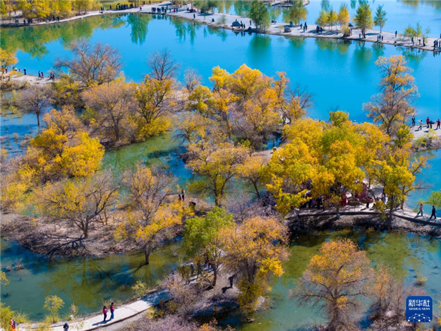 10月4日,游客在位于甘肃省酒泉市的金塔胡杨林景区游览。新华社发(高宏善 摄)