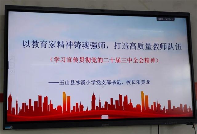 活动最后,学校党支部书记、校长乐美龙同志为所有党员同志上了一堂“以教育家精神铸魂强师,打造高质量教师队伍”的党课,乐美龙同志从“深刻认识党的二十届三中全会的重大意义、准确把握党的二十届三中全会精神的核心要义、把党的二十届三中全会精神落实到全力推动冰小教育高质量发展”三方面做了具体论述。乐美龙强调,学习贯彻党的二十届三中全会精神,既是一项紧迫的政治任务,也是一项长期的政治任务;大家要以此次学习为契机,充分发挥全体党员教师先锋引领作用,积极作为、敢于担当、奋勇前进,以更高站位、更大力度、更实举措推动党的二十届三中全会精神在冰溪小学落地见效,为推动冰溪小学教育高质量发展贡献新的更大力量。