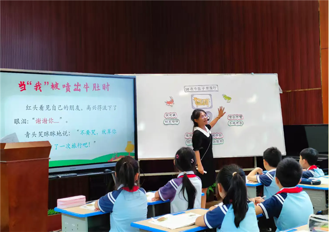 邱黎芳老师执教的是《在牛肚子里旅行》一课。邱老师用甜美的声音和学生合作朗读课文,既展示了语文教师的朗读基本功,又把大家带进了一段奇特的旅程,去感受两只蟋蟀患难见真情的感人现场。