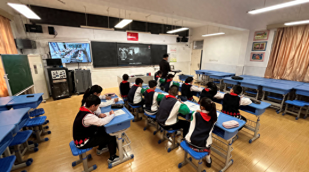 “听听四种乐器,分别属于哪一组”“大家用弹舌模仿一下木鱼声”……10月10日上午,在兴化市合陈镇合陈中心小学的一间教室里,20多名学生全神贯注盯着墙上大屏幕,按照屏幕里老师的步骤学习《北京喜讯到山寨》的管弦乐曲。屏幕另一端,是兴化市第二实验小学的音乐教师沈幼德实时授课。在他绘声绘色的讲授和生动演绎下,合陈中心小学的学生们完成了歌曲的旋律、节拍、乐器等知识的学习。