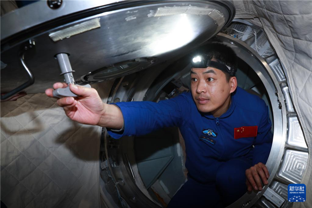 2024年2月5日,神舟十八号航天员乘组在进行植物授粉操作。新华社发(徐部 摄)