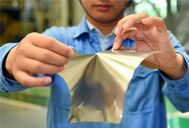 在位于山西的太钢集团,员工展示用手撕开0.02毫米厚的超薄带状不锈钢(2019年5月24日摄)。新华社记者 曹阳 摄