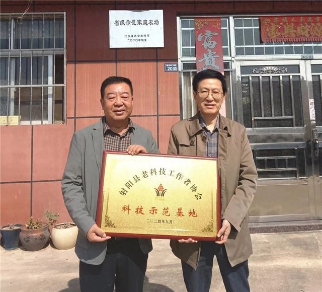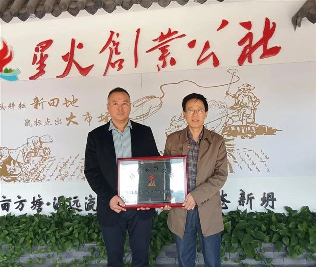在新安村“为平家庭农场”,胡建国为农场负责人授予了“射阳县老科技工作者协会科技示范基地”铜牌。大家实地参观了芡实生产基地,并了解了芡实生产全过程。胡建国强调,企业开拓进取,勇于担当,不断扩大生产规模,助力乡村振兴。