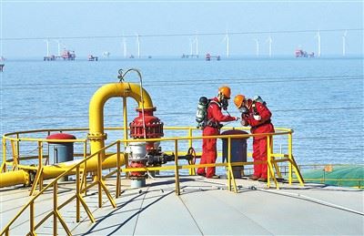 3月19日,在位于山东省东营市的胜利油田海四联合站,员工对储油罐顶部液压安全阀和机械呼吸阀进行维护,避免甲烷等气体外排造成大气污染。胜利油田高标准落实黄河流域生态环境保护专项整治措施,开展“无废油田”和绿色工厂创建,实现了石油开采、管输和储存的全过程绿色清洁生产。王国章摄(人民图片)