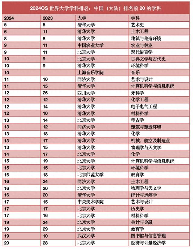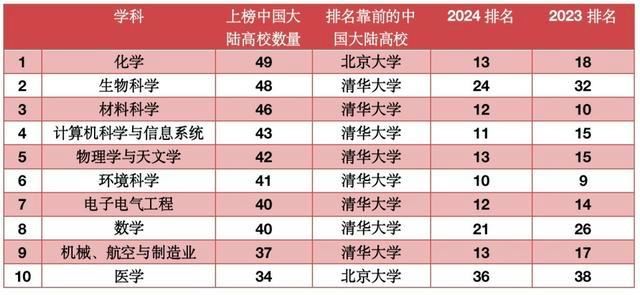 紧随其后的是生物科学,有48个高校入榜,清华大学在该学科领先,上升了八位,全球排名第24。