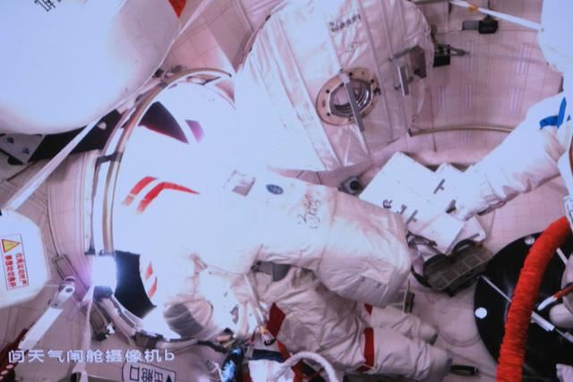 ↑5月28日在北京航天飞行控制中心拍摄的神舟十八号航天员李广苏在空间站组合体舱外作业的画面。