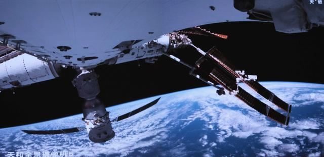 ↑5月28日在北京航天飞行控制中心拍摄的神舟十八号航天员在空间站组合体舱外作业的画面。