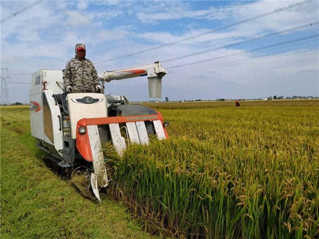 随着金黄色连片成块的水稻陆续成熟,广袤的农田里一株株沉甸甸的稻穗,个个颗粒饱满。记者在从六村田头看到,收割现场一派繁忙的丰收景象。