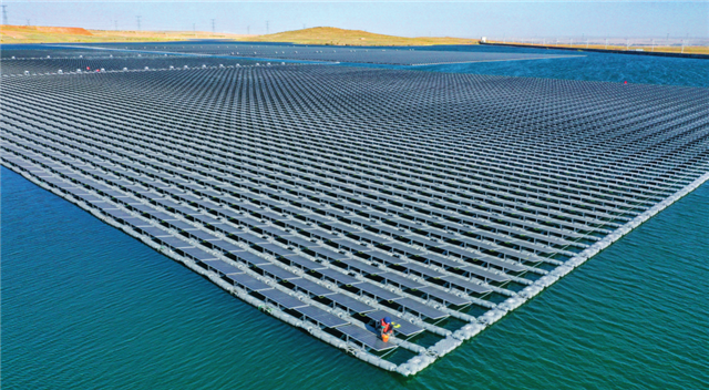 位于宁夏灵武市的国家能源集团宁夏电力公司宁东电厂3×5.98兆瓦漂浮分布式光伏发电项目(2022年6月17日摄)王鹏摄/本刊