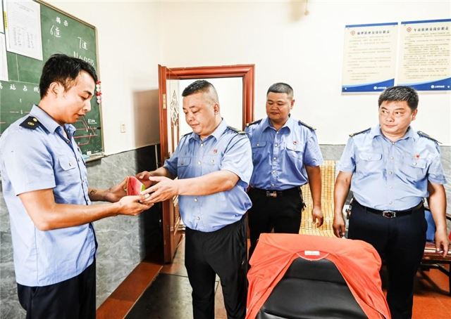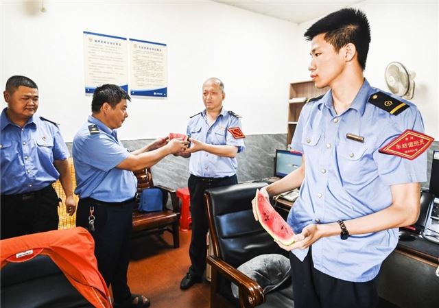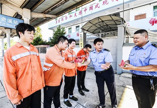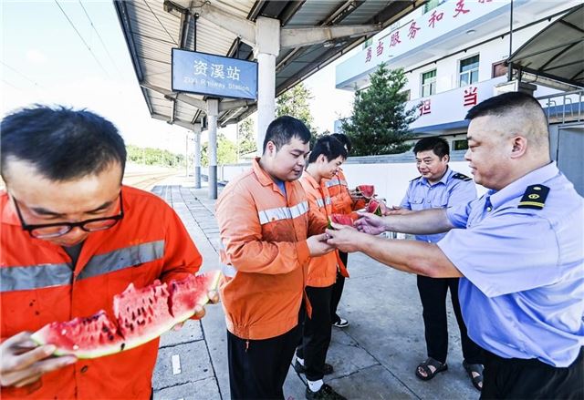 7月24日,江西省抚州市资溪县火车站党员干部为一线工人赠送西瓜。面对持续高温天气,该站党支部组织机关干部将矿泉水、防暑药品送至工人手中,把夏日清凉和关爱送进高温下工作中职工代表的心坎里。
