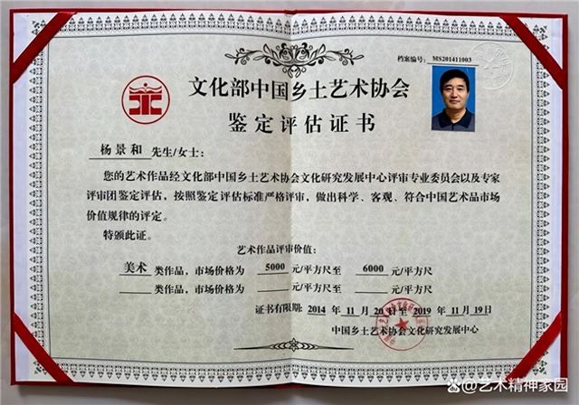 2014年文化部中国乡土艺术协会颁发的鉴定评估证书作出的结果为:杨景和艺术作品评审价值美术类作品,市场价格为每平方尺为5000元至6000元。(以上仅作为收藏者参考)