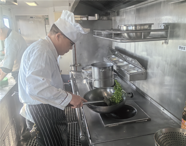 挥勺、颠锅,双手上下翻飞……Z126次列车上,餐车厨师刘冬林师傅正为旅客现场烹制美食。