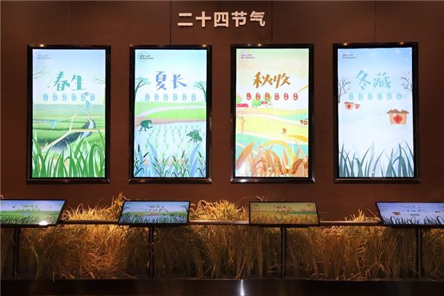 “在距今16000年前的江西万年县仙人洞遗址中发现野生稻遗迹。中国先民成功驯化的水稻现在已成为当今世界三大主粮之一,养活了全球60%的人口......”讲解员在稻麦与人类文明篇章中通过时间脉络向小朋友们介绍稻麦农业从起源到发展到兴盛的全过程。接着,小朋友们兴致勃勃地通过二维动画和互动游戏的形式,了解了二十四节气。