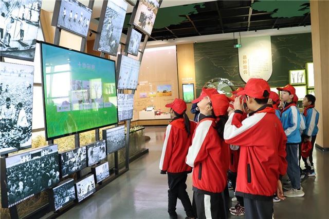 参观完一、二楼展区,小朋友们乘电梯来到三楼,眺望一望无际的稻田,远处大型收割机在金黄的稻浪里穿梭,装粮车在高标准农田项目区循环道上奔驰,近处的大型稻田画诉说着今年又是一个丰收年。