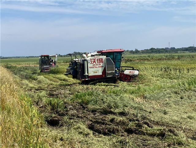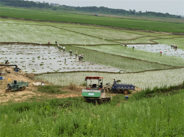 堤内万亩良田内一派收割繁忙景象,该乡早稻播种面积42862.12亩。为将洪涝灾害损失降到最低,该乡及早组织早稻收割,全乡调动了61台收割机,进驻莲北、莲南圩堤内,进行早稻抢收,同时针对堤内1600多亩良田内涝,乡内3座电排站积极排水,并增加了16座小型抽水泵日夜作业,使内涝得到有效控制,确保早稻抢收颗粒归仓,二晚抢栽正常进行。在莲北圩龙口段圩内,记者看到有20多位妇女正在田内抢栽二晚,朱家村种粮户伍凯生说,他家农田内涝刚排完,他就组织了附近村庄妇女来帮忙抢栽,每天可栽秧20多亩。