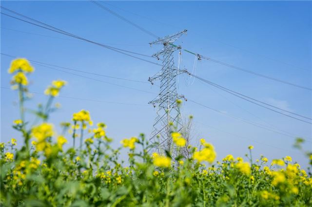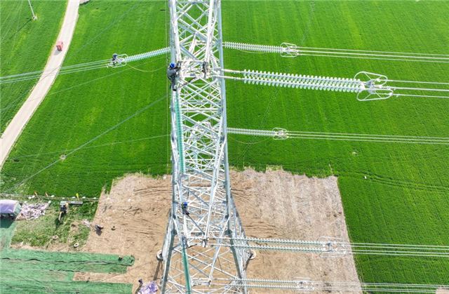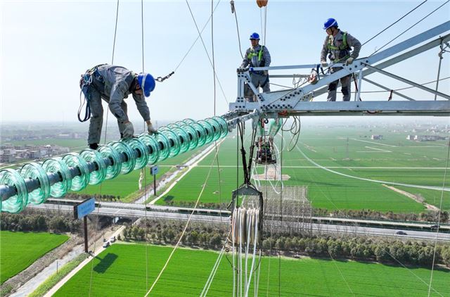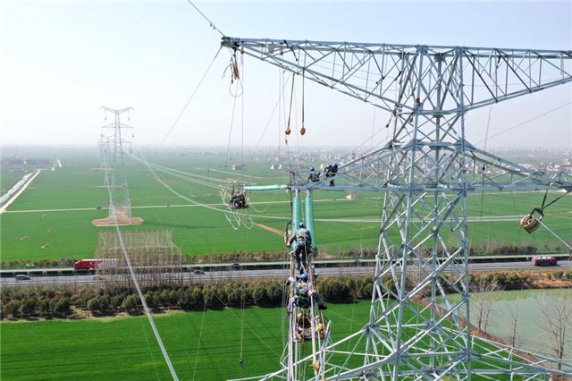 在位于安徽阜阳境内的利辛电厂二期500千伏送出工程现场,工人们抢抓春季有利天气,进行导地线展放和高空附件安装作业,持续推进工程建设。