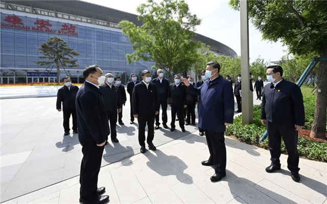 2023年5月10日上午,习近平在雄安城际站及国贸中心项目建设现场考察。